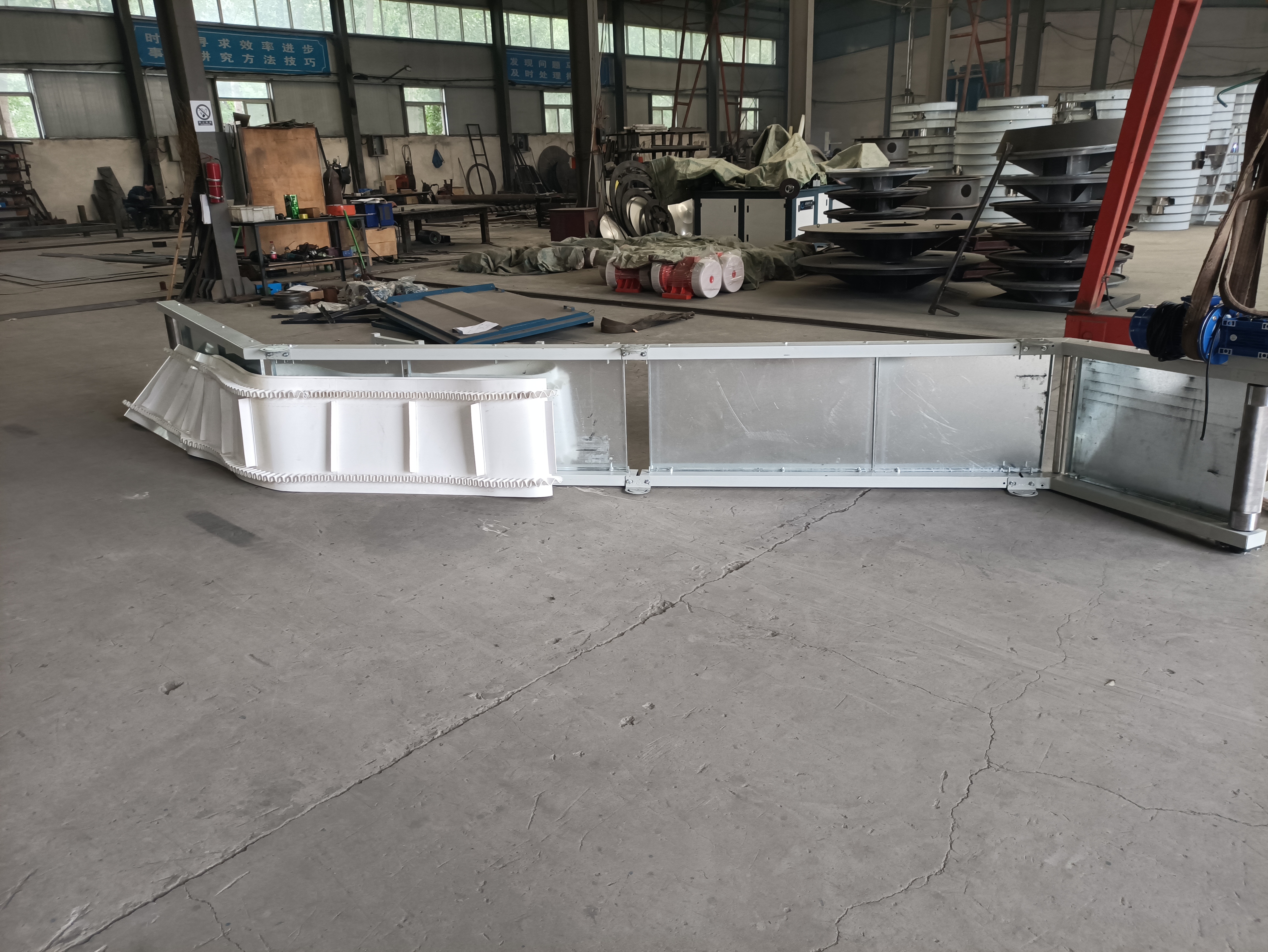 針對粉狀、顆粒狀物料:首選波狀擋邊帶加隔板系統(tǒng)。這種組合能形成封閉的匣形空間,有效防止物料在傾角高達(dá)60°甚至90°的爬升過程中滑落和飛揚(yáng)。同時要求設(shè)備具備良好的密封結(jié)構(gòu)。